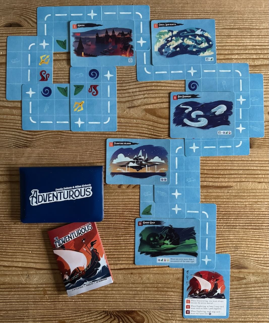 In essence: Adventurous is a solo game, with an option to play it co-operatively (so take that 1-4 player count with a very hefty pinch of salt!). Lay down cards — in an overlapping (sprawlopolis-ish) style — to chart a single, continuous, dotted-line route across the ocean. Your route cards also show a variety of symbols; whirlpools, sharks, tridents and tentacles … and you have a number of “marvel” cards that you need to place into your tableau by covering up a requisite set of symbols specific to that marvel. Lay out all of your cards successfully, and you then get a score based on the length of your route, whether you got all the marvel cards played, and how many “uncovered” symbols are still showing in your tableau (with too many symbols of a specific kind causing you to go “bust”, and score nothing in that category).